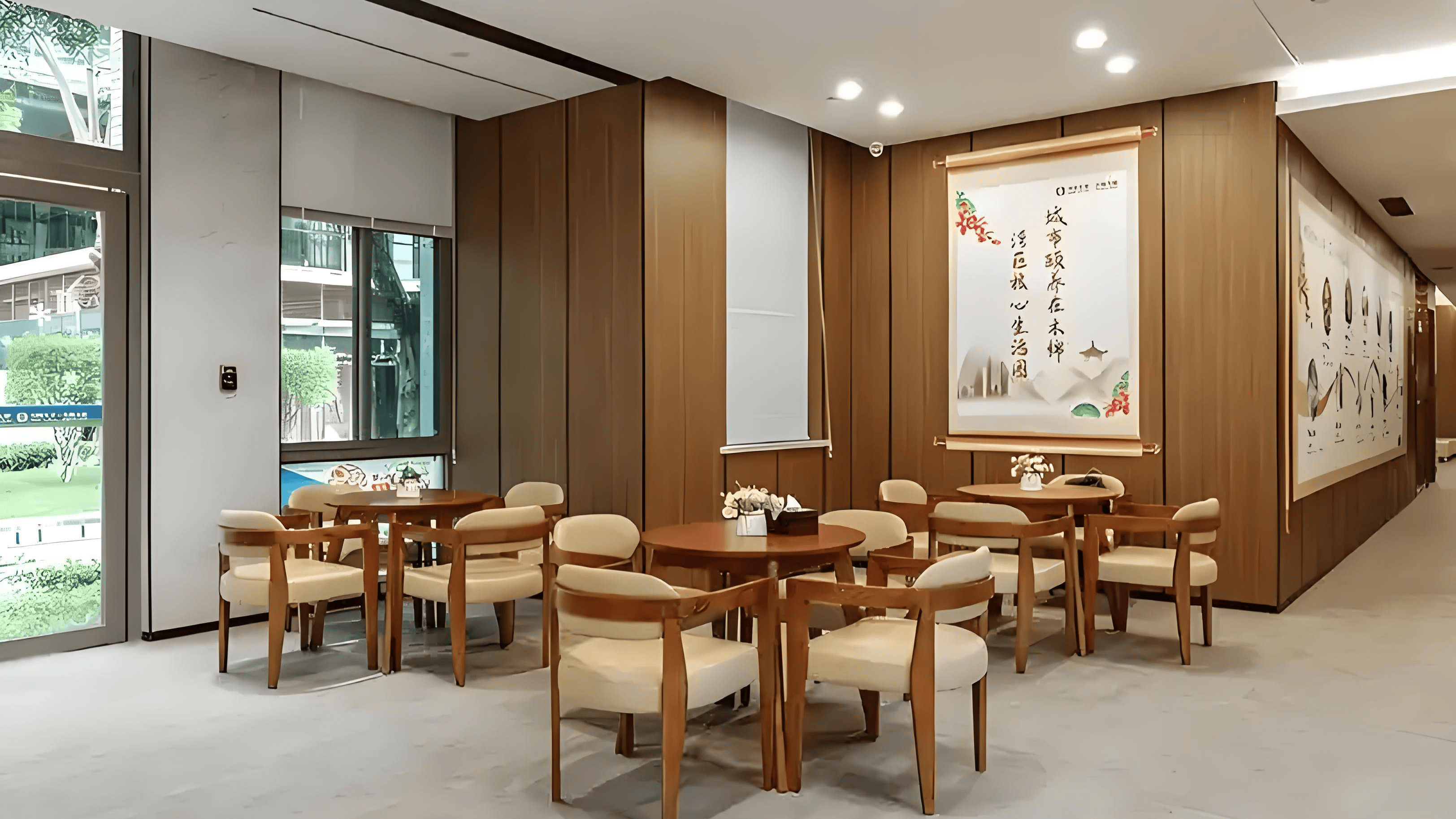 居住空间:提供单间(48㎡)、一室一厅(85㎡)、两室一厅(105㎡)三种户型,满足独居、夫妻同住及亲友探访等场景。房间内家具边角采用圆弧形防撞处理,厨房地面铺设防滑材料,卫生间配置双层扶手(高度85cm与95cm)及紧急呼叫系统,灯光色温控制在3000K以减少眩光。